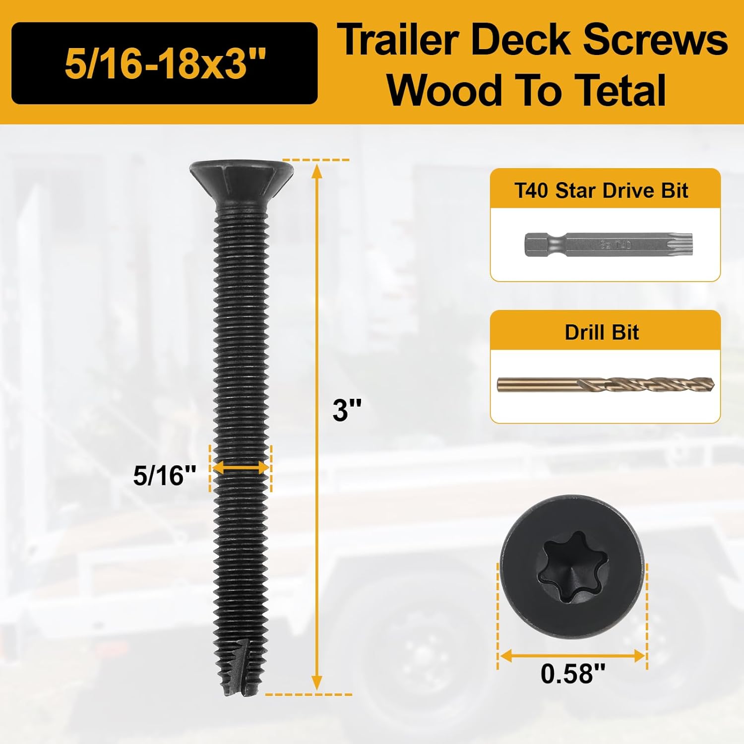• [High-Strength & Durable Performance]Our 5/16-18 x 3" trailer deck screws feature a thread-cutting (Type 7) design that resists torque, shear, and tension, ensuring a secure hold under heavy loads. Made from hardened steel with black phosphate coating, they resist rust and corrosion for long-lasting use in trailers, flooring, and outdoor projects.