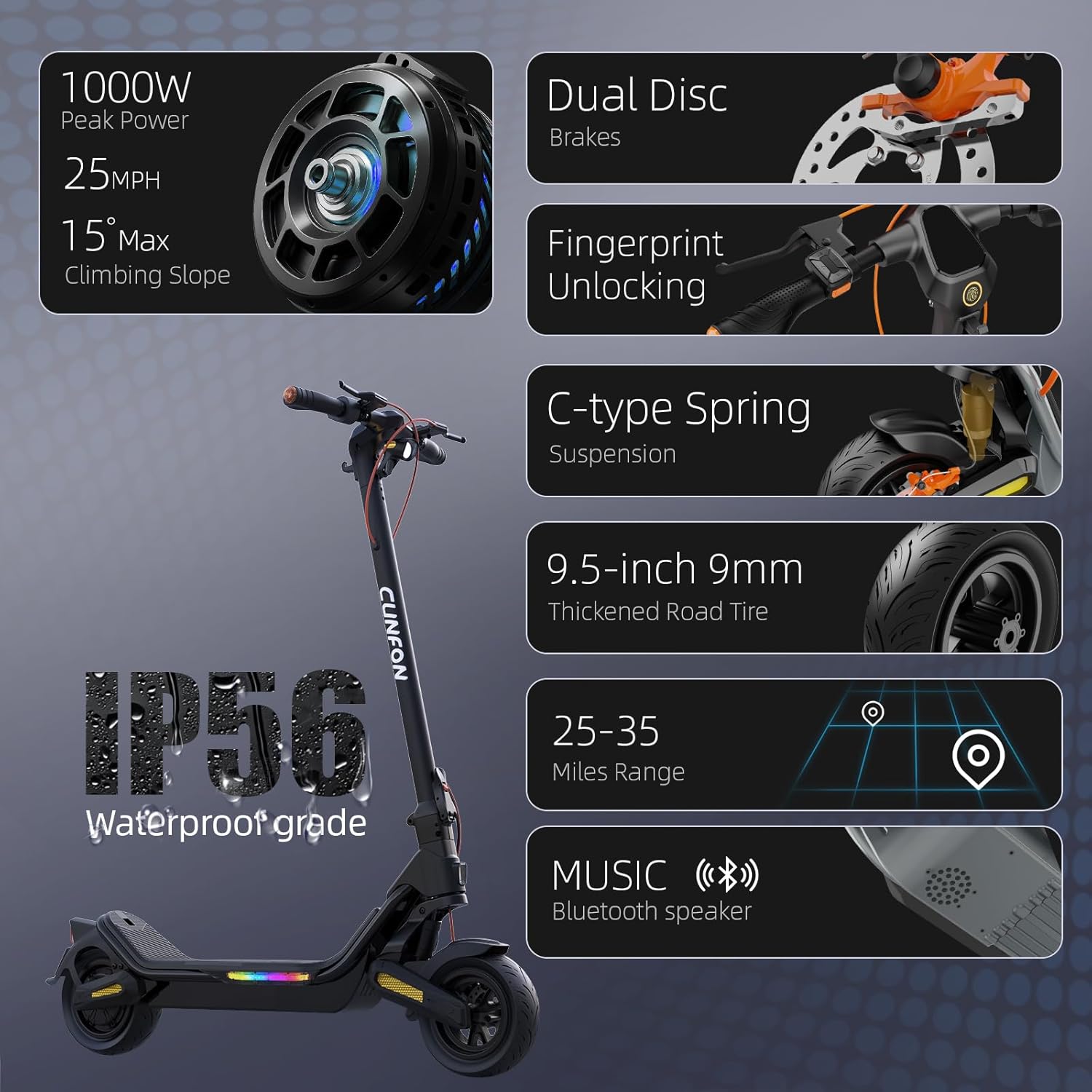 | Other Special Features of the Product | 9.5-inch 9mm Thickened Tubeless Rubber Road Tire, C-type Air suspension system, CUNFON C+Ride Stability Technology, Fingerprint Unlock,Cruise Control, Turn Signals, UL 2272 Certified |