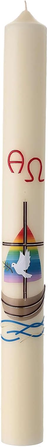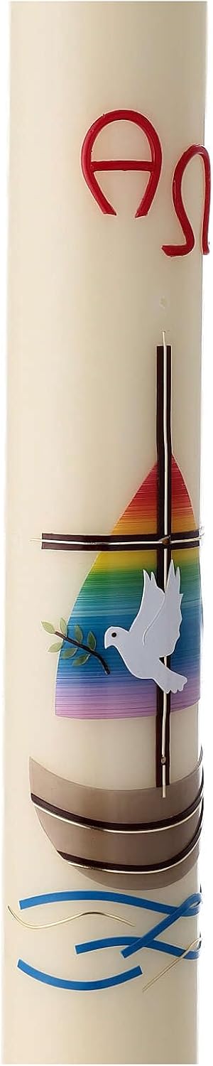 Modern Easter candle with Noah's ark, dove and rainbow 80x8 cm. Modern style Easter candle depicting Noah's ark, the dove of peace and the rainbow. The mast of the ship is represented by the Cross, while the dove carries an olive branch in its beak.Separately attached there are five golden stud tacks in relief. Handcrafted by a historic German waxworks. Made of paraffin and beeswax and decorated by hand. Height: 80cm. Diameter: 8cm. Weight: 4.50 g - Article Size: Candle diameter: 8 cm|Candle height: 80 cm - Article Materials: 90% Paraffin, 10% Beeswax - PRODUCT CODE: CN001939