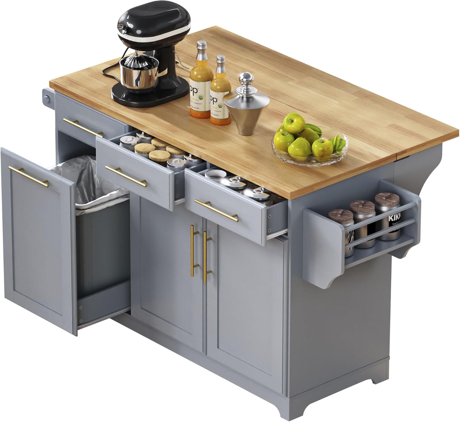 SOFTSEA Rolling Kitchen Island with Trash Can Storage Product Type: Kitchen Island Cart Material: P2 Grade Environmental MDF + Rubber Wood Tabletop Overall Dimensions: 59.3" L × 29.5" W × 35.6" H Product Weight: 127.87 lbs Number of Packages: 2 Package 1 Size: 36.77" × 20.94" × 6.38" (43.21 lbs) Package 2 Size: 52.76" × 21.65" × 7.87" (97.89 lbs) Total Package Weight: 141.1 lbs Tabletop Weight Capacity: 400 lbs Trash Can Capacity: 50 lbs Shelf Weight Capacity: 75 lbs Drop Leaf Weight Capacity: 33 lbs Assembly Required: Yes Estimated Assembly Time: 40–60 minutes Country of Origin: Vietnam Product Care: Wipe with a soft dry towel; avoid harsh chemicals and household cleaners Color Notice: Actual product color may vary slightly due to lighting or monitor settings Size Notice: Manual measurement may result in slight dimensional variations.
