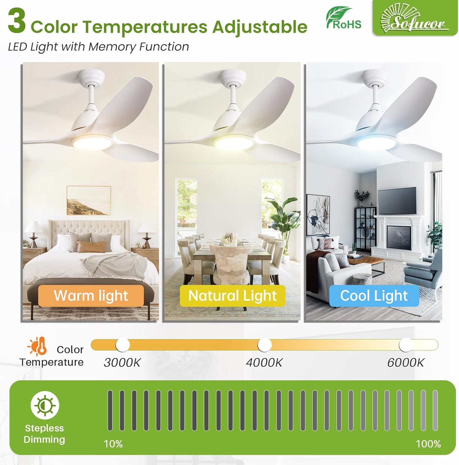 | Included Components | DC Motor, Downrods(5/10/24inch), Fan Blades, LED Light, User Manual, Remote |