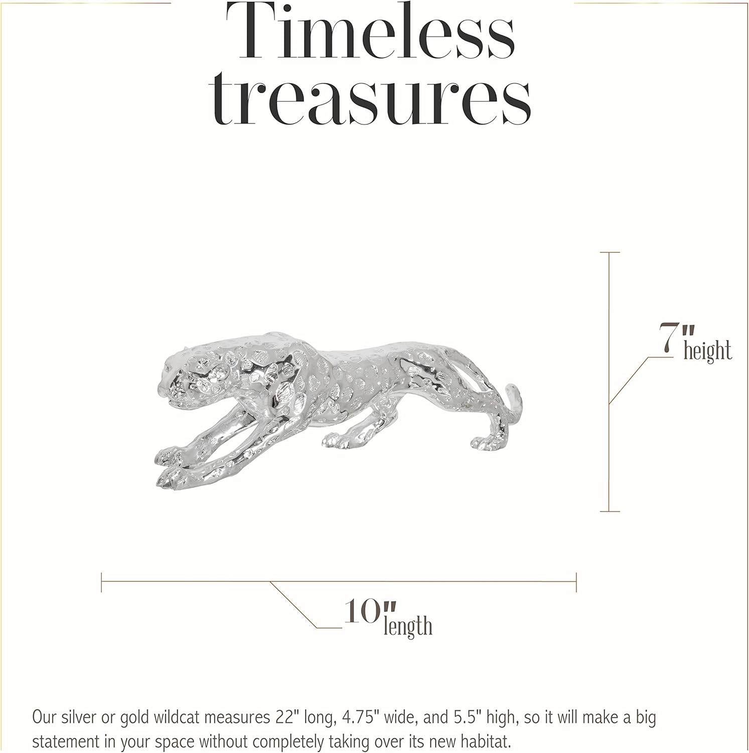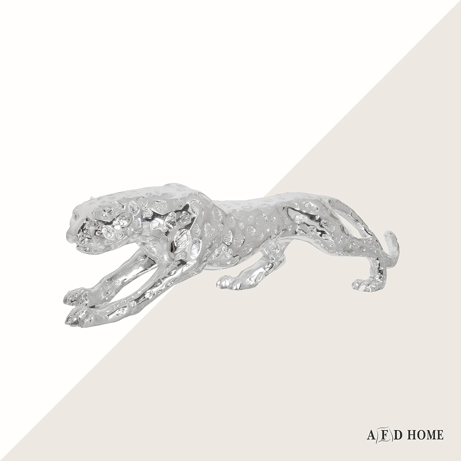 A popular decorative Standing Silver Leopard 22 Inches Long sculpture of walking Leopard, the artists depicted this animal in a prowling position showing movement. Hand cast in ceramic and resin. Features a striking Silver plated finish.