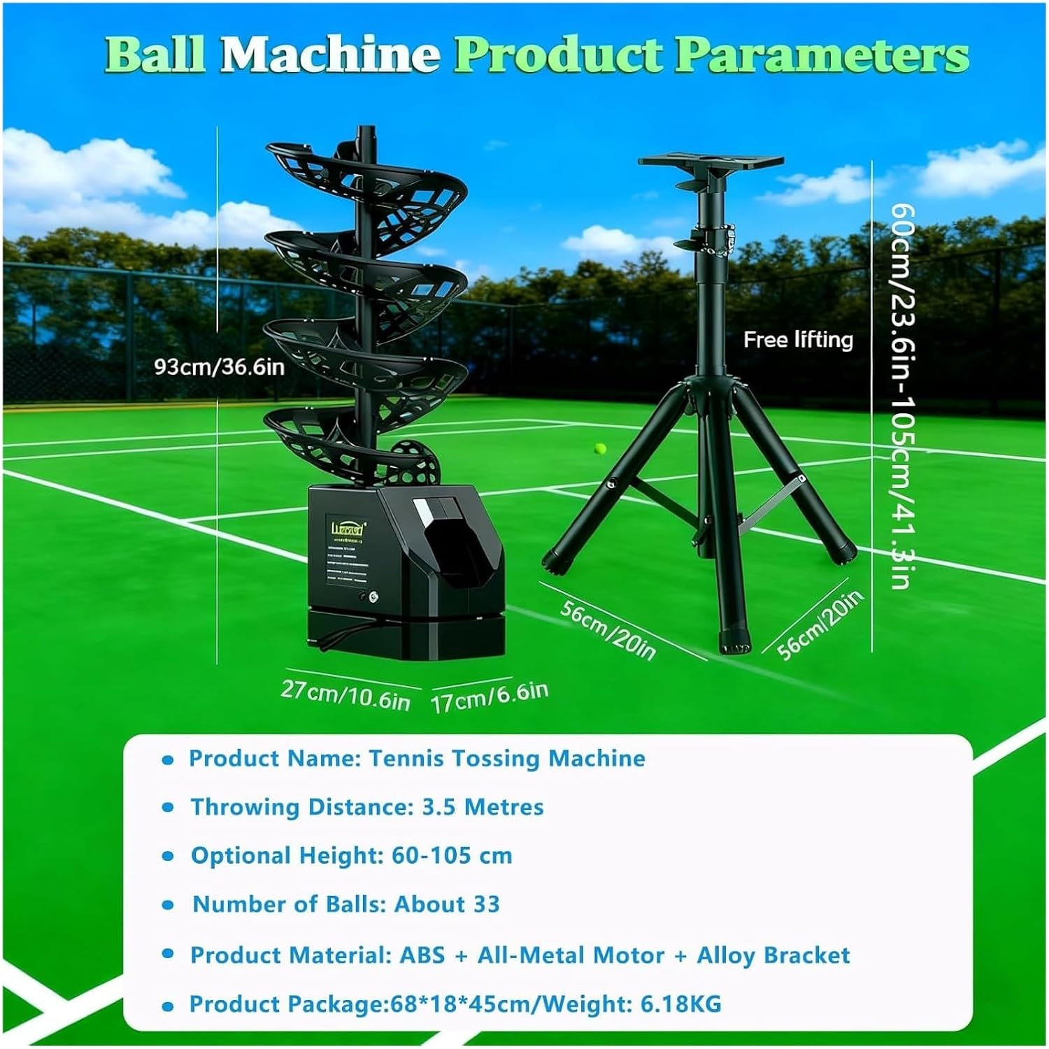 This tennis ball machine is your ideal training partner. Its flexibility and ease of use help you improve your tennis skills at any level. Furthermore, it offers a variety of modes to meet your diverse training needs, whether it's quick reaction drills or long-distance shot practice.Designed for beginners, intermediate, and advanced players, this tennis ball machine aims to enhance your skills at every stage of your tennis career. Its simple operation and versatile functions make it ideal for individual training, group practice, and even family entertainment. Improve your timing, accuracy, and overall level with this essential tennis training tool.Specifications:Product Name: Tennis Ball ServerMaterial: ABS + All-Metal Motor + Alloy BracketPackage Dimensions: 68x15x45cmColor: BlackWeight: 6 kg / 13.2 lbsBall Capacity: 33 ballsMaximum Throwing Distance: 3.5 m / 11.5 ftHeight Adjustment Range: 60-105 cm / 23.6-41.3 inControl Method: Remote ControlRotation Angle: 48°Package Includes:1 tennis ball launcher (ball not included)1 remote control1 charger1 height-adjustable tripod1 set of batteries1 instruction manual