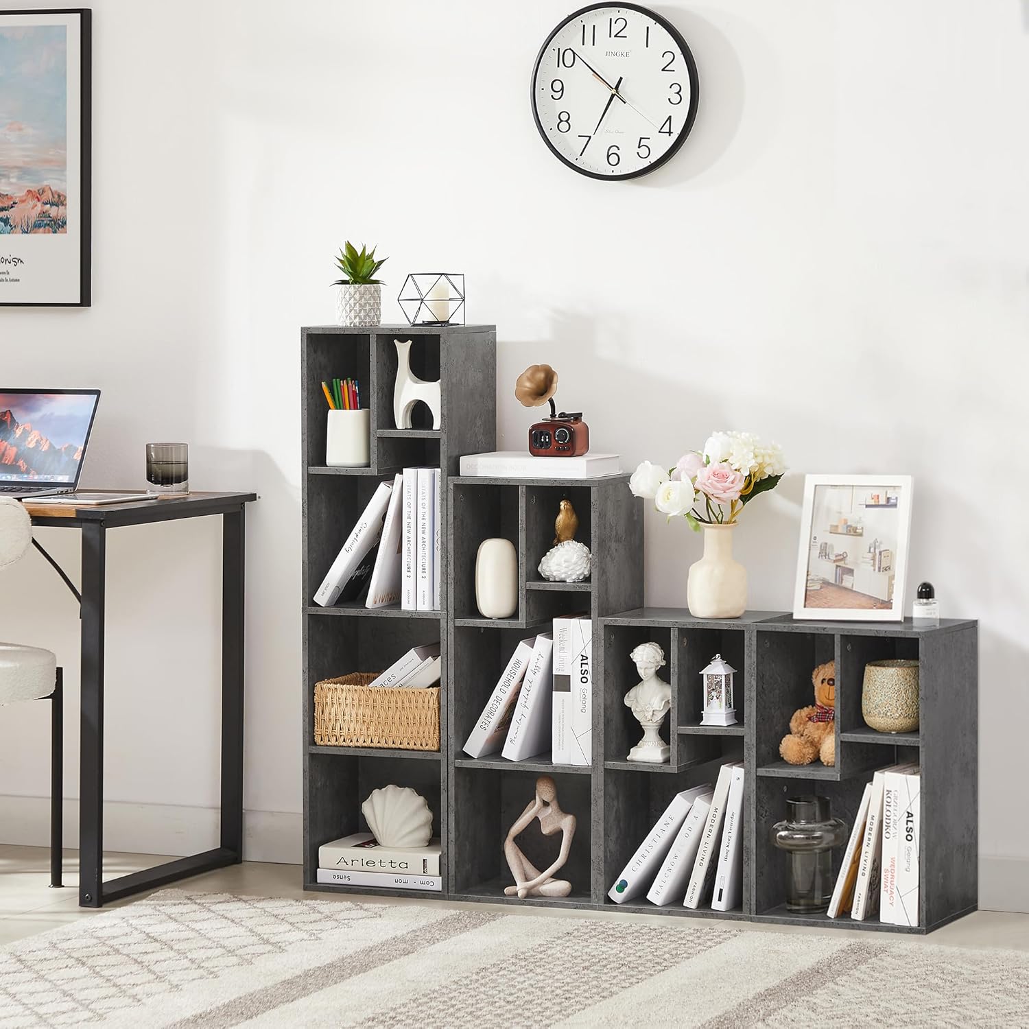 For Our Customers:Home is where the heart is, why not make your home tidy and clean via this VECELO Bookshelves series? With four colors and eight styles, there must be a suitable one for you. The pearl white tones of the shelves will amplify the mysterious, warm atmosphere without stealing the show of your accent taste. Specifications: - Color: Pearl White/ Black/Grey/Rustic Brown- Material: Particle Board- Product Size: 9.5”D x 11.8”W x 21.4”H (24 x 30 x 54 cm)- Product Weight: 24.2 lb (11 kg)- Max. Static Load Capacity per Shelf: 66 lbsPackage Contents:- 1 x Bookcase- 1 x Accessory Kit- 1 x InstructionsVECELO Notes: - For safety reasons, children are not allowed to climb on or play with the product. - For daily maintenance, wipe with a damp cloth.- If there are any problems with the product you received, please contact us to get free parts or a BRAND NEW item for replacement.