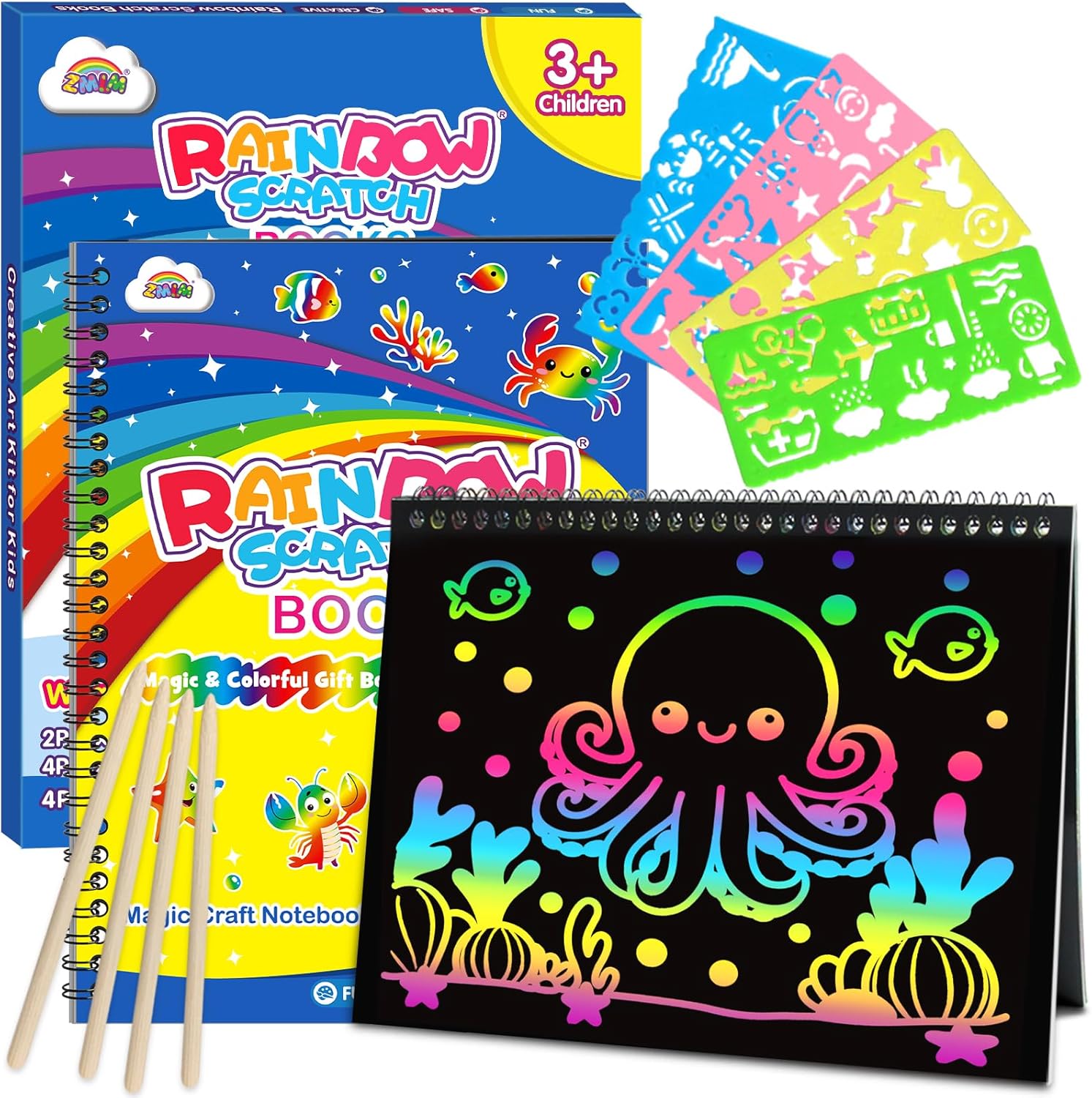 | Included Components | 2 Pack Rainbow Scratch Notebooks, 4 Pack Cartoon Template, 4 Pack Scratch Pencil |