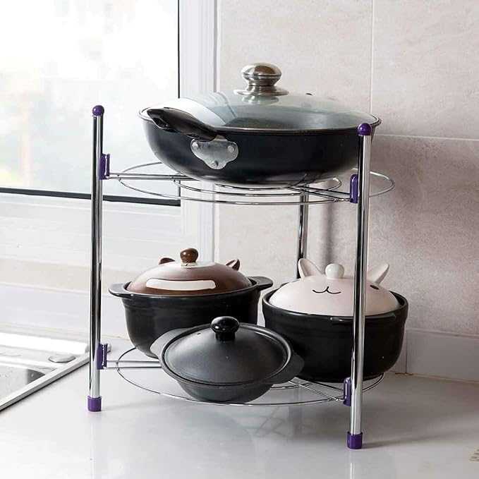 Saucepan Frying Pan Pot Storage Rack Shelf Stand Kitchen Organizer 2/3/5 Tiers Product Description: Ideal for holding pots in kitchen, making more space available Made of iron, durable to use 2 kinds are available, 2 layers and 3 layers Specification: Material:Steel Size:35.7x38.2 cm 14.06x15.04 inch (2 layers) 35.7x51 cm 14.06x20.08 inch (3 layers) Weight:975~1395g Color:As shown Package included:1*Storage Rack